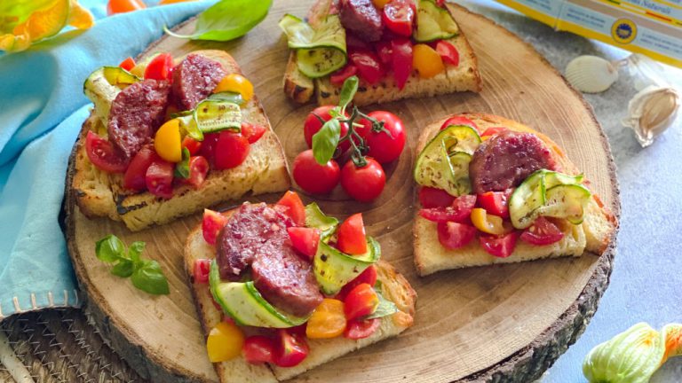 Queste bruschette estive e coloratissime con il Cotechino Modena IGP, pomodorini, e zucchine grigliate sono una proposta fresca e particolare per portare a tavola il cotechino anche ad Agosto.