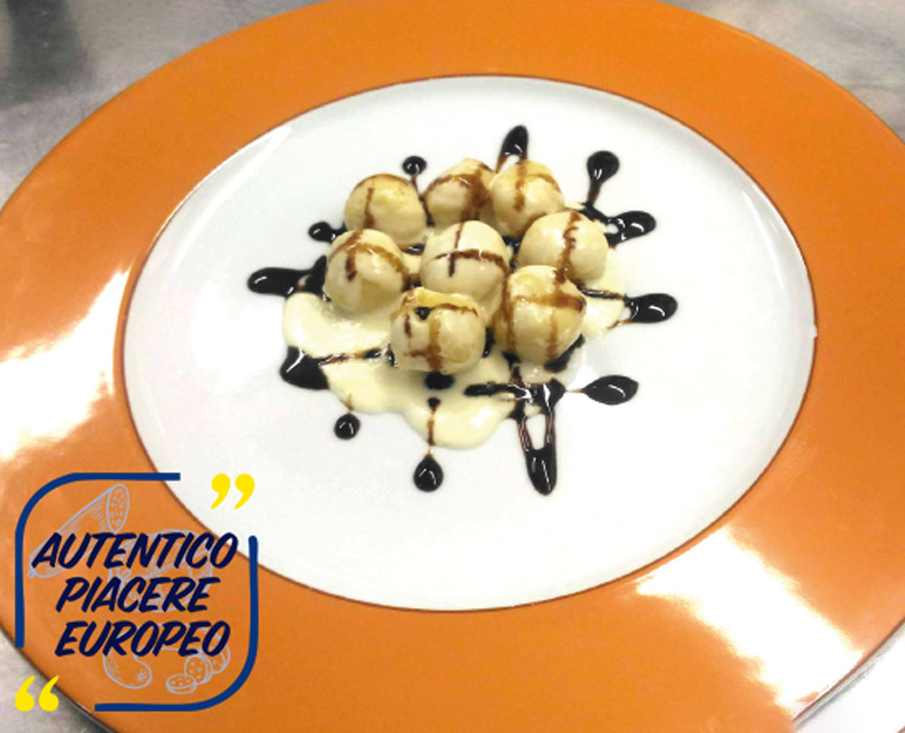 Sfere di patate ripiene con Cotechino Modena IGP, crema di parmigiano e gocce di Aceto Balsamico Tradizionale Modena DOP